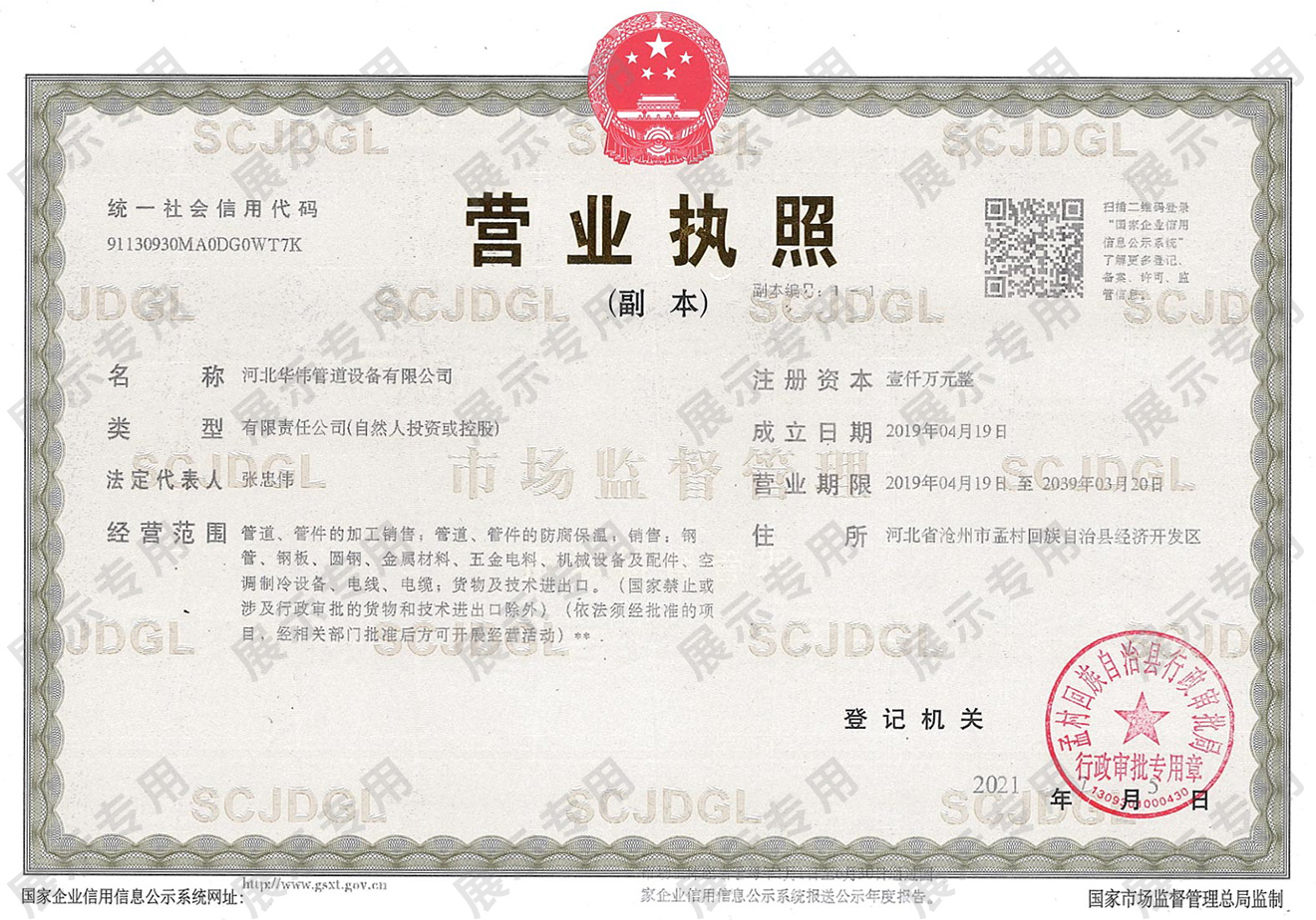 河北華偉管道設(shè)備有限公司將全力擴(kuò)展市場份額,爭取為國內(nèi)、國際重大項(xiàng)目的管道應(yīng)用提供更優(yōu)質(zhì)的產(chǎn)品,做出更大的貢獻(xiàn)。河北華偉管道設(shè)備有限公司以“質(zhì)量是生命,發(fā)展靠信譽(yù)”為宗旨,以優(yōu)質(zhì)的產(chǎn)品、合理的價(jià)格、良好的服務(wù),與國內(nèi)外新老用戶真誠合作,共創(chuàng)美好未來!